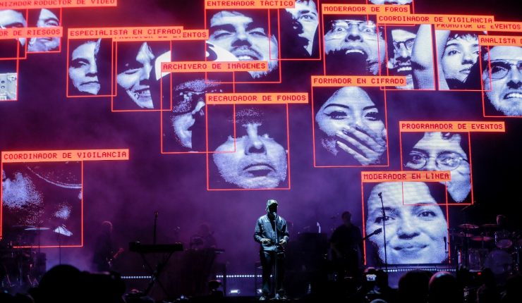 Desde el inicio, el show estableció su propósito: esto no sería solo entretenimiento. Una muestra de reconocimiento facial de los asistentes apareció proyectada en la pantalla, anticipando el tono crítico que dominaría la velada. La banda utilizó su plataforma para cuestionar directamente las redes sociales, la inteligencia artificial y las decisiones políticas que moldean nuestro presente.