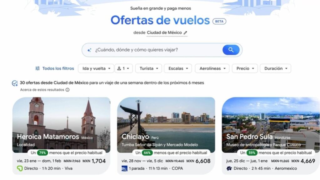 Esta funcionalidad se distingue por el uso de la IA avanzada de Google para una comprensión profunda de la intención de búsqueda, lo que permite identificar con precisión los destinos más adecuados. Posteriormente, utiliza la información en tiempo real de Google Vuelos para desplegar rápidamente opciones pertinentes y actualizadas, provenientes de una vasta red de aerolíneas y plataformas de reserva.