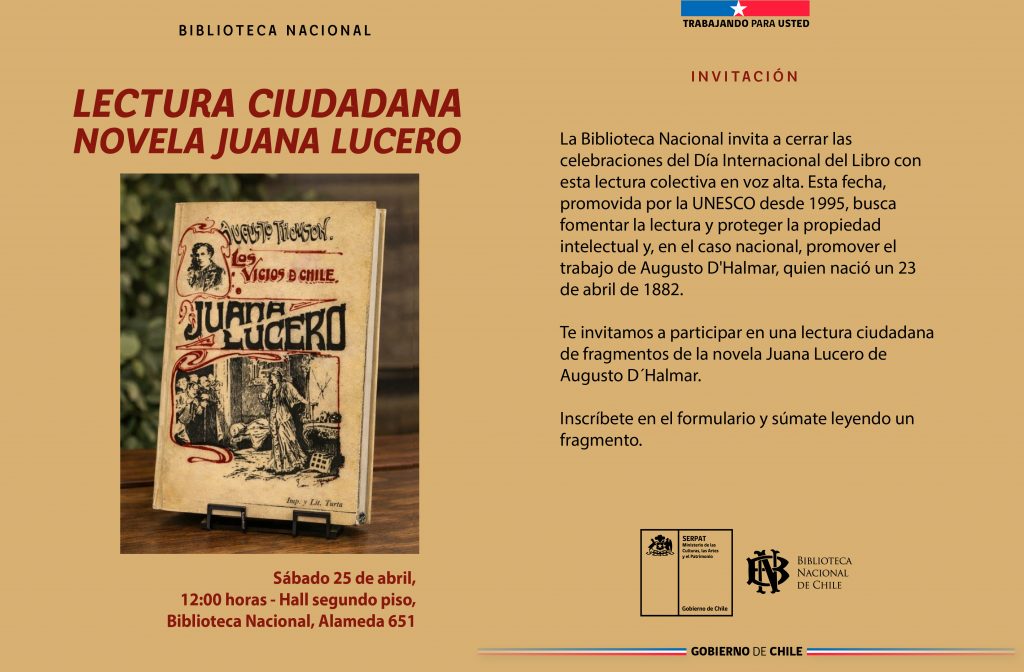 Las actividades continúan el sábado 25 de abril con una lectura ciudadana centrada en Augusto D’Halmar, con fragmentos de Juana Lucero al mediodía (12:00) en el hall del segundo piso (sector Alameda), con inscripción mediante un enlace publicado en el Instagram de la Biblioteca Nacional.
