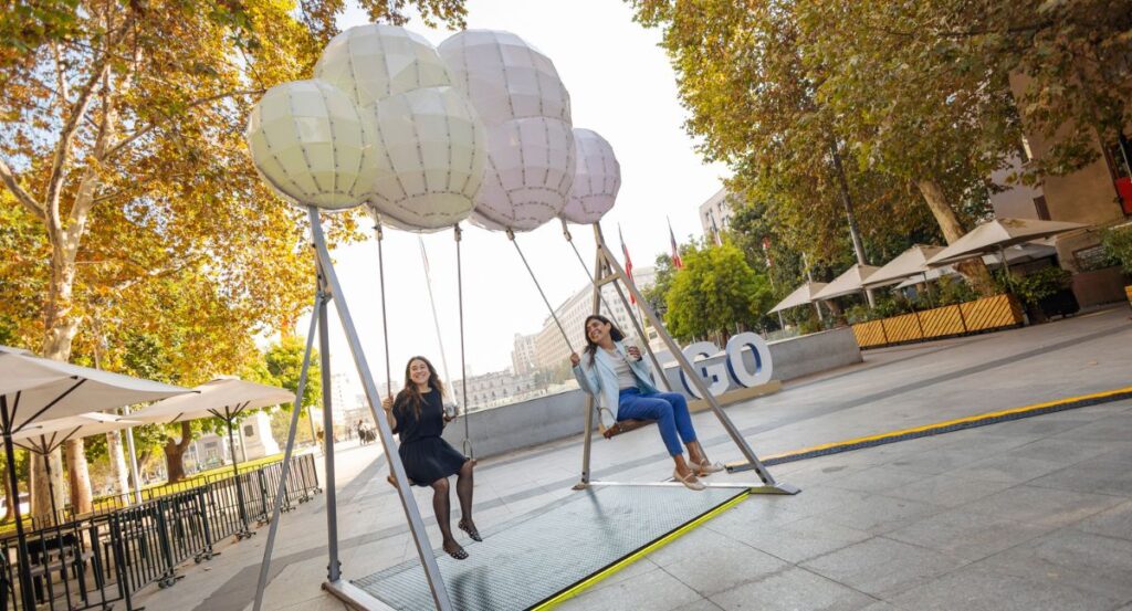 Por primera vez y a gran escala se va a exhibir en Sudamérica la obra que ha causado asombro en distintos festivales y museos en el mundo. Desde hoy The Cloud Swing se instala en Santiago centro, específicamente en el paseo Bulnes para invitar a la gente a subirse, columpiarse en la nube y conectar. La propuesta es simple: columpiarse y al sumarse otra persona las nubes se iluminarán con los colores del arco iris.